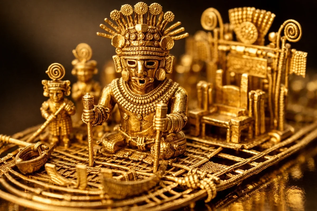 Secondo le cronache e i ritrovamenti archeologici, ogni nuovo sovrano (lo Zipa) veniva sottoposto a un rito di iniziazione presso il lago Guatavita. Il corpo del leader veniva spalmato di resina e ricoperto interamente di polvere d’oro, trasformandolo in una statua vivente. Accompagnato da sacerdoti su una zattera, lo Zipa si immergeva nelle acque sacre per offrire oro e smeraldi agli dei. Per i Muisca, l’oro non aveva un valore monetario; era un materiale simbolico, capace di intrappolare l’energia solare e stabilire un contatto con il divino.