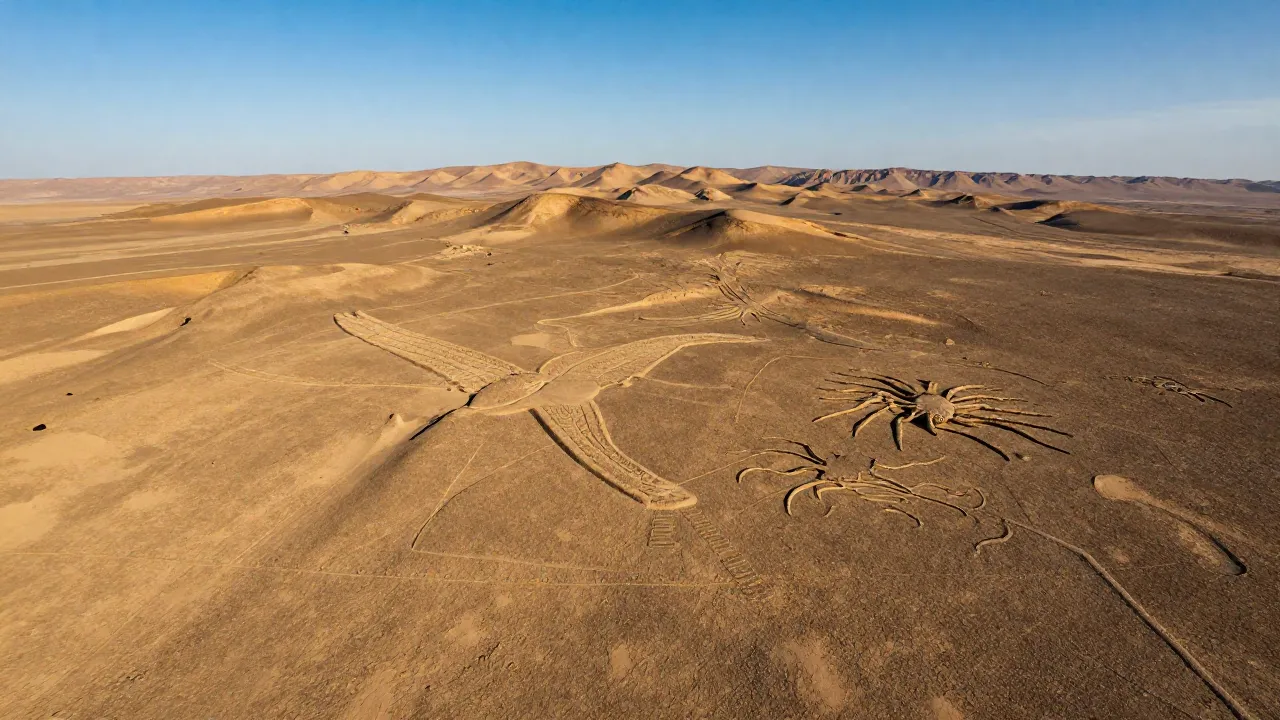 Nel cuore del deserto di Nazca, la terra è incisa da figure lunghe centinaia di metri che rappresentano animali, piante e forme geometriche. Questi geoglifi sono stati realizzati rimuovendo lo strato superficiale di pietre scure per rivelare il terreno chiaro sottostante.