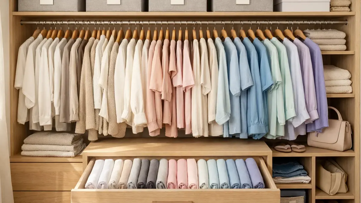 Dividere i vestiti per categorie (camicie, pantaloni, maglie) è il primo passo per un guardaroba ben organizzato. All’interno di ogni categoria, l’ordinamento per colore non è solo una scelta estetica, ma un trucco per trovare immediatamente l’abbinamento desiderato. Iniziare dai toni chiari per sfumare verso i più scuri crea un senso di armonia visiva immediato.