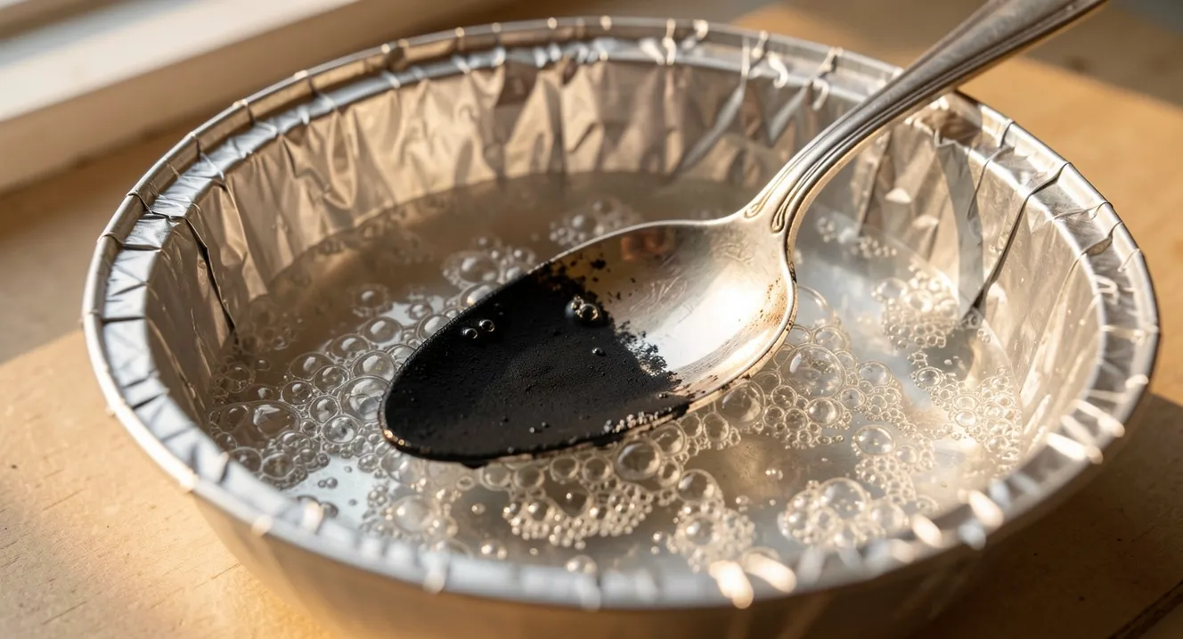 - Il contatto: Quando l’argento annerito tocca l’alluminio immerso in questa soluzione, avviene una piccola magia chimica. Lo zolfo “abbandona” l’argento per legarsi all’alluminio (che diventerà scuro al posto del vostro gioiello).