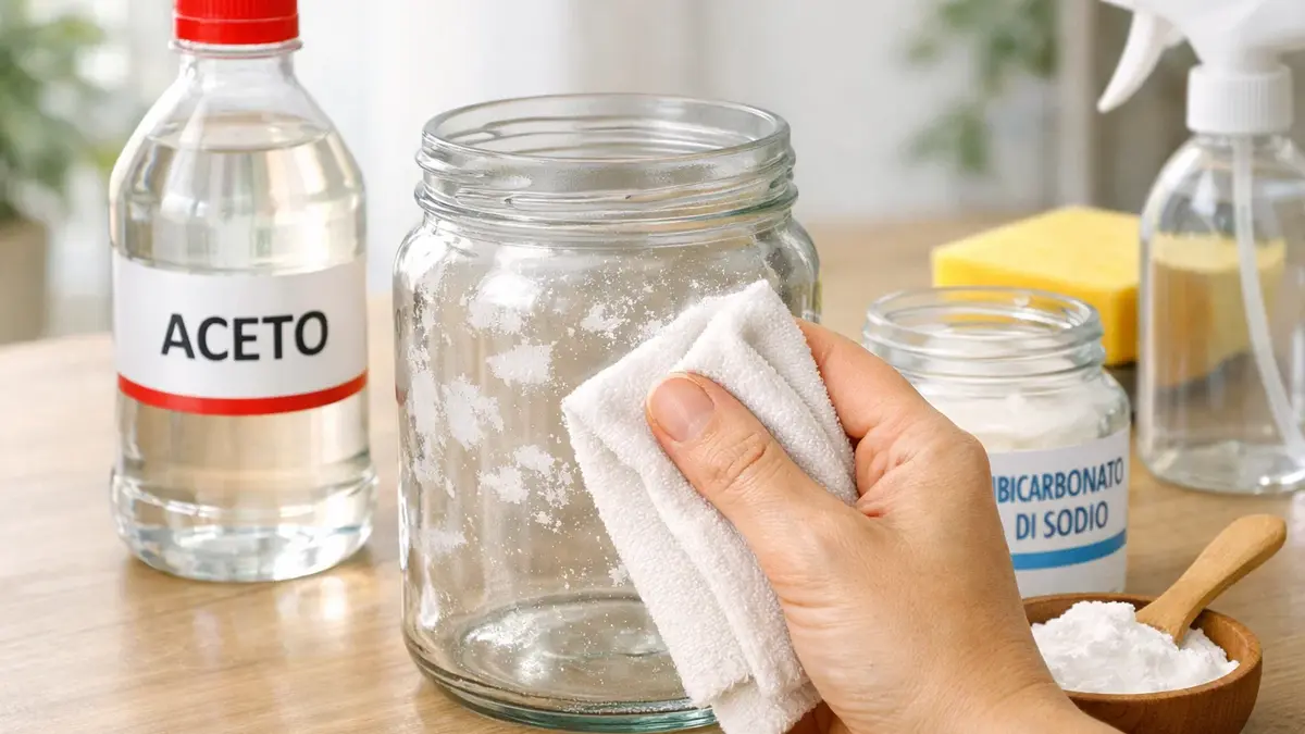 Per i residui più resistenti, acqua calda e bicarbonato di sodio rappresentano una combinazione efficace e sicura. L’acqua ammorbidisce la colla, mentre il bicarbonato agisce come abrasivo leggero. Strofina delicatamente e poi lava il vetro con sapone neutro.