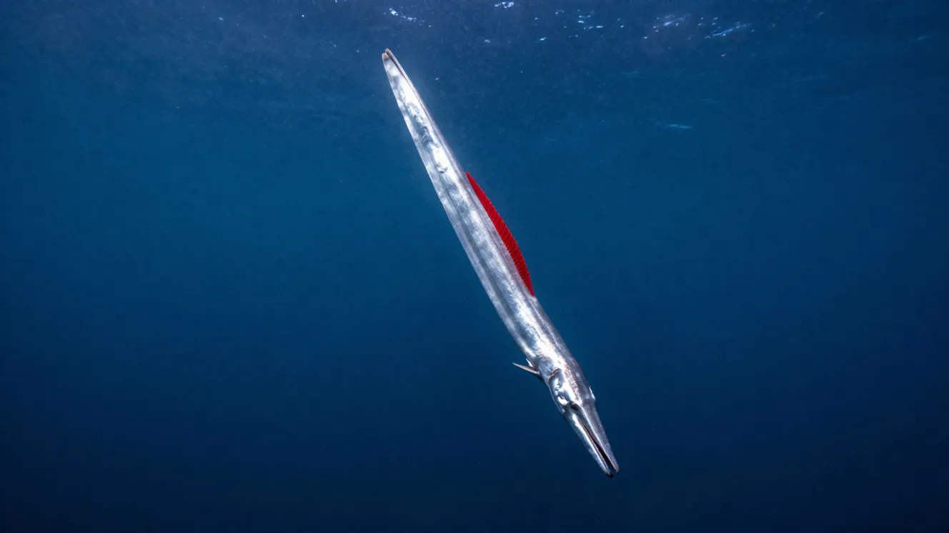Il Regaleco è il pesce osseo più lungo del mondo, capace di raggiungere e superare gli 8 metri di lunghezza. Il suo corpo è una lama d’argento priva di scaglie, sormontato da una pinna dorsale scarlatta che si protrae in una cresta simile a una corona. Vive nella zona mesopelagica, tra i 200 e i 1.000 metri di profondità, dove la luce solare svanisce nell’oscurità perenne.